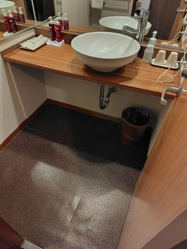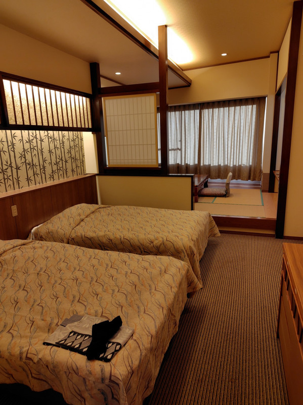今回はまさご亭・和洋室(45㎡)に1泊、部屋は10階。和室6畳とセミダブルのツインの洋室。洗面所、トイレ、浴室は別。浴室は狭いが大浴場に行くので問題なし。