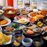 朝食は3階レストラン「やまびこ」で和洋バイキングです。地元富山の食材を使用しており、焼き魚や練り物も豊富。できたてが味わえるオープンキッチンもありますよ。焼き立てパンやフルーツも選べます。
