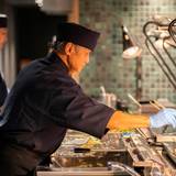 夕食は3階のレストラン「やまびこ」でのしゃぶしゃぶ付きバイキングか、「四季の蔵」での会席料理が選べます。天ぷらや鉄板焼きなど目の前でシェフが調理してくれますよ。黒部の名水で仕込んだ地酒もおすすめ♪