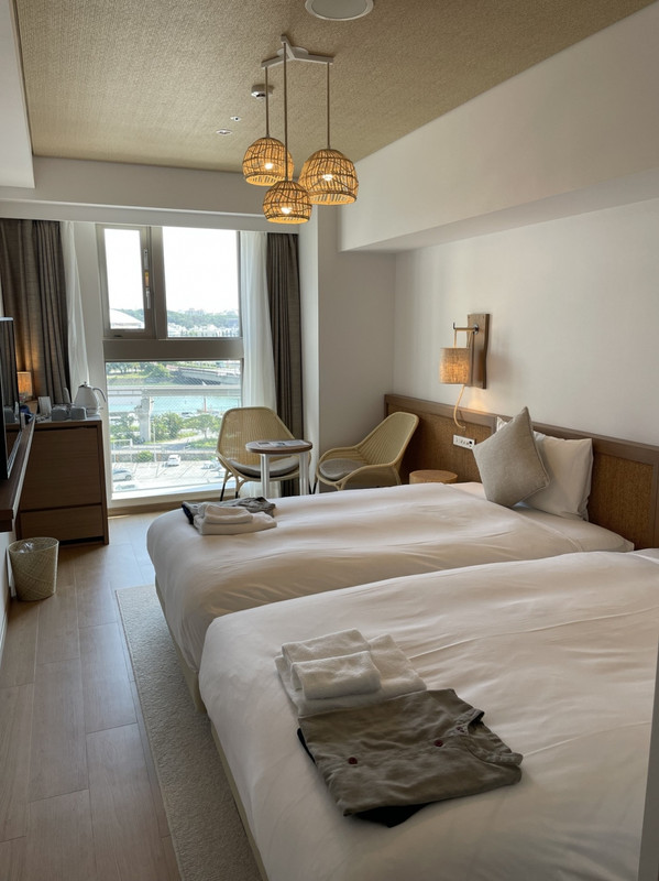 新しくて施設も部屋もきれいでした。モノレールの駅からも近く、アクセスも便利です。最上階に大浴場があります。お湯は熱すぎず、ちょうど良かったです。ツインでしたが、ミネラルウォーターのボトルが2本ついてました。