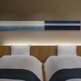 ロビーはガラス張りで、灯台を望む開放的な空間。日本海に沈む太陽をデザインした壁面アートは写真映えバッチリです。チェックインを済ませたら、打ち出の小槌のキーホルダーが付いたルームキーを持って客室に向かいましょう。