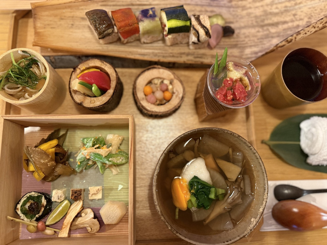 朝食は夕食と同じく禅坊料理。彩り豊かな発酵おばんざいを中心に、季節のお粥とデザートが付きます。杉板焼き豆腐万願寺味噌やラディッシュの甘酒漬けなど、聞き慣れないメニューがズラリ。館内の好きな場所でいただきましょう。