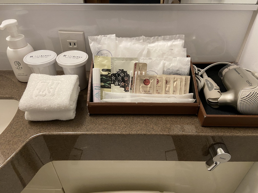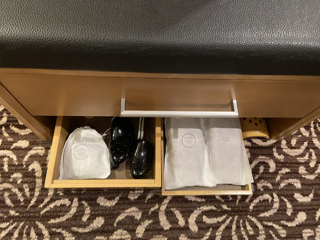 最広のスイートに宿泊。客室には東京ながらのお菓子や、シューキーパー、青竹踏みもあり、ビジネスパーソンの癒しを考えているホテルだなと感じます。