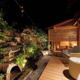 夕食の後は、夜風を感じながら温泉浴。全室に自家源泉掛け流しの専用露天風呂があり、好きな時に温泉を楽しめます。遠州面紬の作務衣やオリジナルアメニティなど、備品も上質。とことん贅沢な気分に浸れますよ。