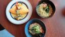 朝の名物3品。鯛の切り身がいっぱいの「鯛ご飯」、バジル風味のソースが新しい「オムレツ」、地元の風習を由来にした「海鮮朝ラーメン」はどれも美味♪