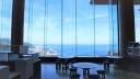 高さ約6mの窓からは、海と空が一体に見えてきれいです。オープンは8:30。お子様はラウンジにある絵本を読み、大人は景色を見てまったりするのも◎