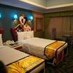 部屋に入るとまずサイドの壁絵にルミエール達がいたり、扉がステンドガラス風だったりと、美女と野獣の世界観ばっちりでした。ベッドは王様のベッドみたいでした。
