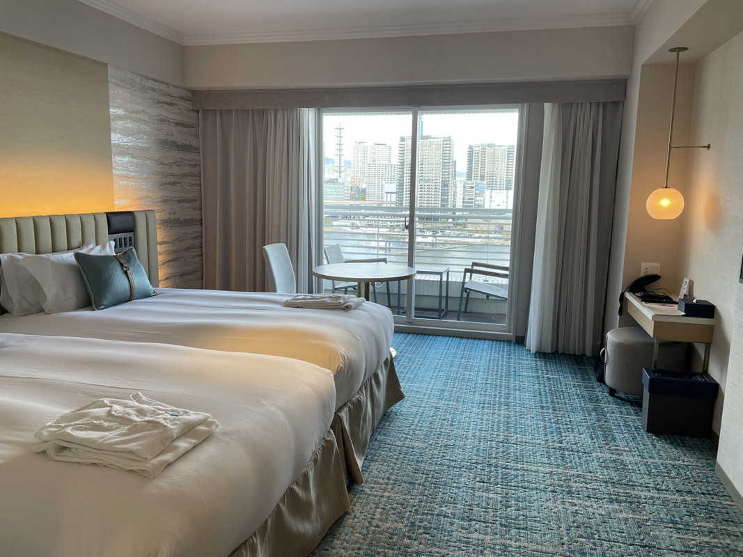 部屋から見える夜景がとても綺麗で、またスポーツジムのテラスからの眺めもとても良かったです。ウェルカムドリンクのスパークリングワインとお菓子のサービスも嬉しい。夜のビュッフェと、ジムのスタッフの方は特に親切で感じが良く、快適に運動や食事ができました。ワッフルやフレンチトーストが特に美味しかったです。
