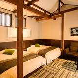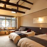 草津温泉の名所“湯畑”を窓から望めるツインベッドタイプのお部屋。梁(はり)や柱など古木のぬくもりを感じられる空間で、癒しのひとときを。3名様利用の場合はソファーベッドをご用意。