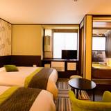 ゆったりとした広さのツインベッドタイプのお部屋。ソファーベッドを入れると3名でも宿泊可能。和モダンの落ち着いた雰囲気で癒しの時間を過ごせそう。基本的な設えは「湯畑ビュー客室」と同じなので、湯畑の眺望にこだわらなければこちらでお得に宿泊も〇