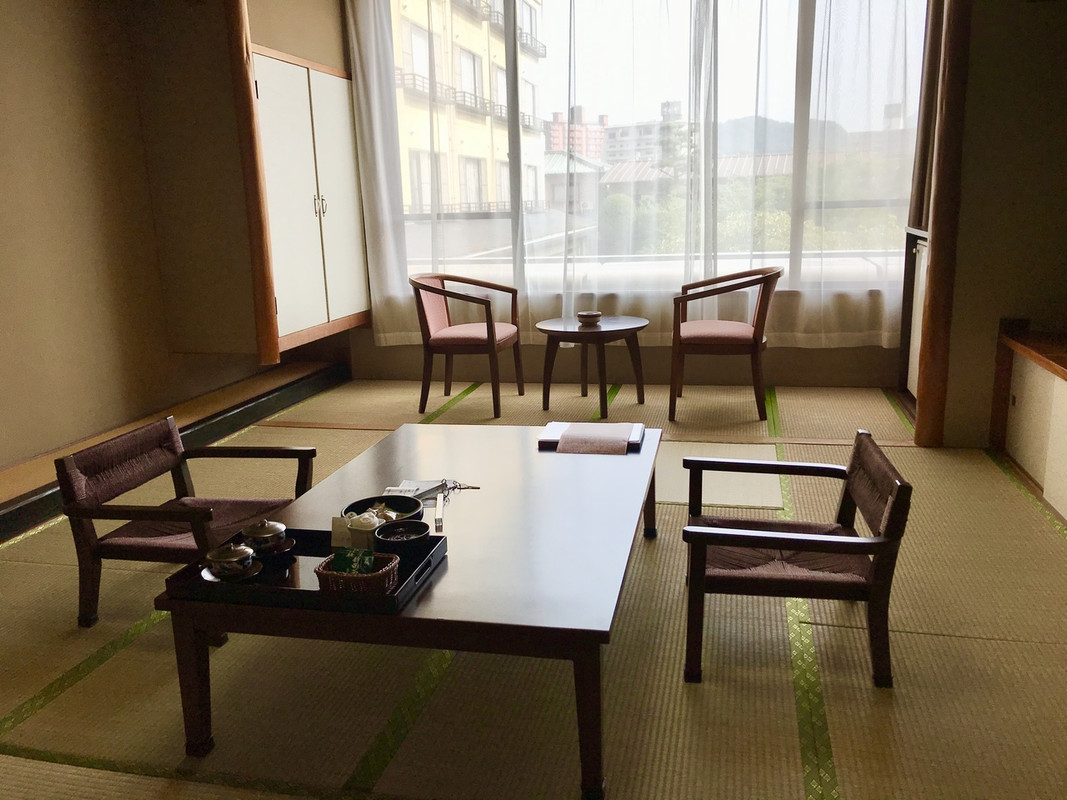 本館客室はレトロな和室や露天風呂付き客室など8種類。「あやめ亭和洋室」は和室、洋室、バスルームを備えた広さのあるお部屋で、庭園を眺めつつゆったりと過ごせます。