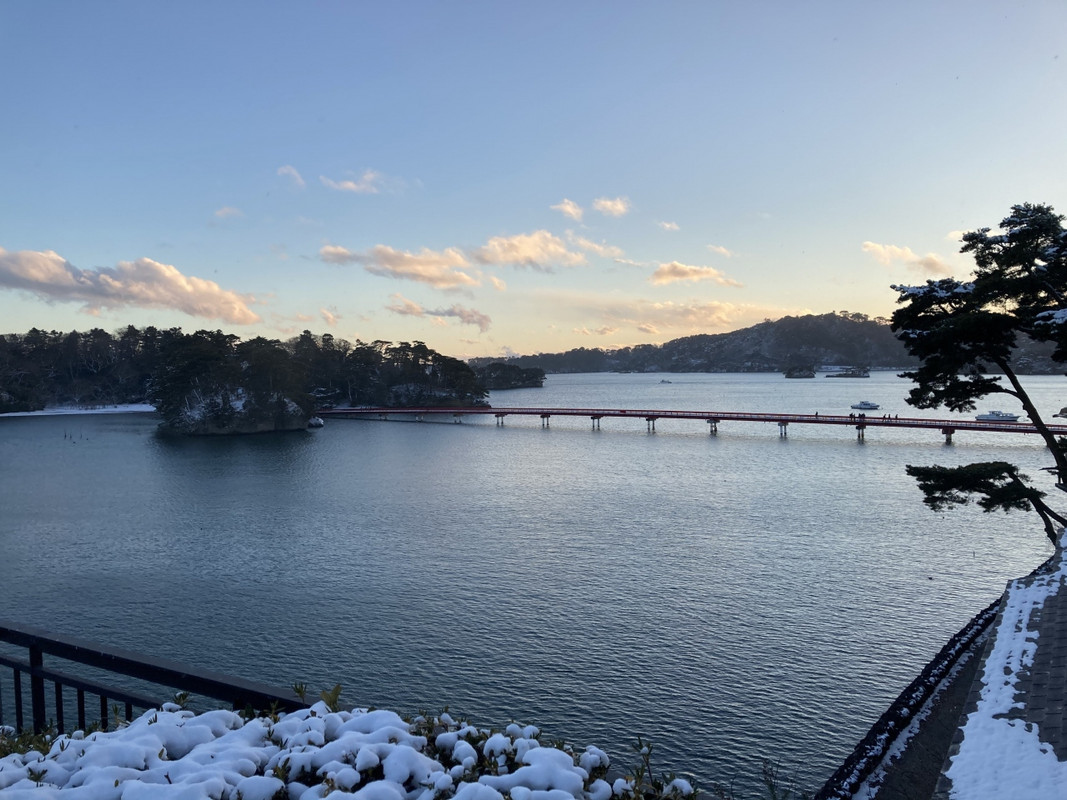 宿に向かう前に「稲庭うどん 瀧さわ家」で冬季限定の比内地鶏のあったかせいろをいただきました。松島が一望できる「カフェ・ル・ロマン」も景色が良かったです。