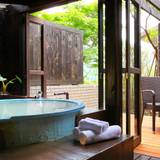 全室に「大涌谷温泉」かけ流しの露天風呂が付いています。露天風呂も客室によって雰囲気が様々。リラックス効果が高いと言われる酸性の泉質に浸かってのんびりしながら、まずは乾杯♪