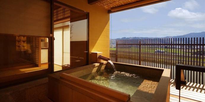 半露天風呂付きの客室では、掛け流しの源泉を好きな時に楽しめます。中でも特別室の半露天風呂は、大人2人でも入れるゆったりとした広さで贅沢。目の前には筑後川や山々の美しい風景が広がり、とことんリフレッシュできますよ。