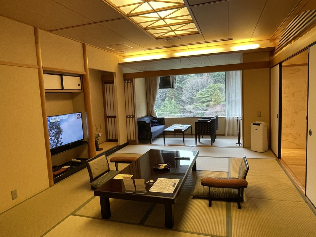 3室限定の露天風呂付客室に宿泊しました。部屋露天は広くはありませんが、浸かると綺麗な山の緑が目に入り、とてもゆっくりできます。備え付けのアメニティとして、浴衣だけでなく作務衣もあり、就寝時用にパジャマ持参が定番の我が家はとても助かりました。
