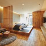 客室は全8室。3人のデザイナーが手がけた露天風呂付きデザイン客室や、半露天風呂付きの和室、古民家風和洋室などのスタイリッシュな部屋が揃っています。曲線を組み合わせたデザインの客室「紃~shun~」も個性的。
