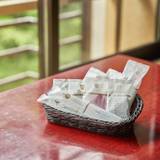 野菜たっぷりの和朝食で身体をやさしく目覚めさせて。13品目もの地元野菜が入ったおみそ汁で、ほっと落ち着けますよ。手作りのお豆腐、イワナの一夜干しなど、滋味あふれる朝ごはんで元気をチャージ。