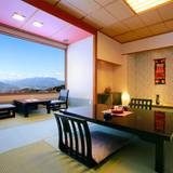 トイレ・風呂付き12畳の客室。窓からは信州の山々が見渡せて眺望抜群
