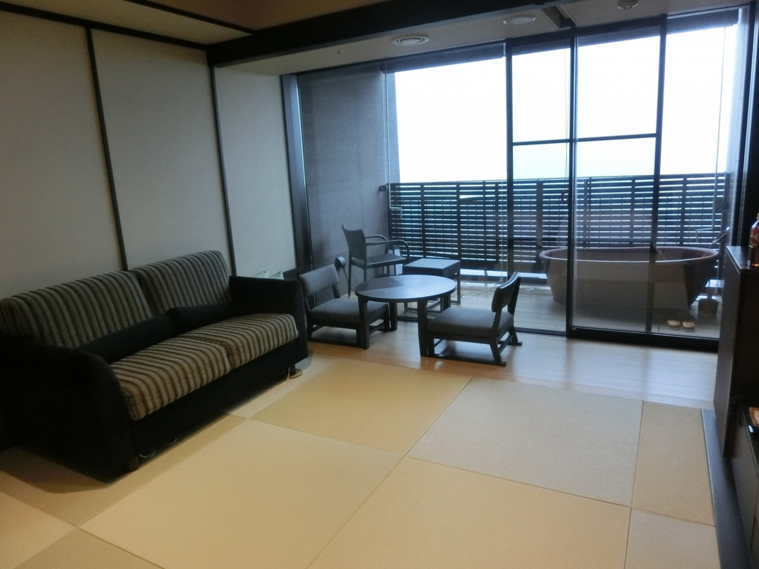 なんと客室の展望バルコニーに温泉給湯付きの瀬戸焼のバスタブがあり入浴し放題
