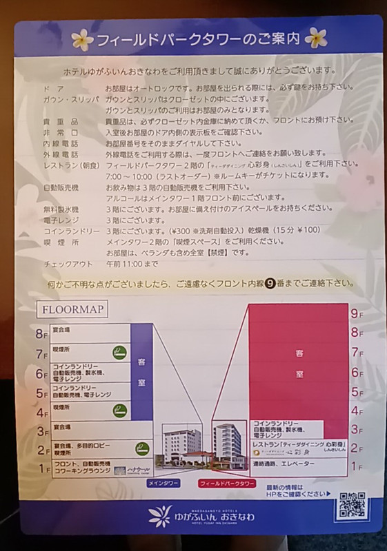 メインタワーとフィールドパークタワーの2棟に分かれている。部屋はフィールドパークタワーだった。洗面所(お風呂)の換気扇を止めるスイッチがなく常時運転。駐車場は平置きだが、3箇所に分かれている為わかりづらいかも。部屋の窓は開く。アメニティもに一通り揃っている。朝食は7時~で種類多めだった。名護拠点の観光に立地もよく大通り沿いで場所もわかりやすかった。