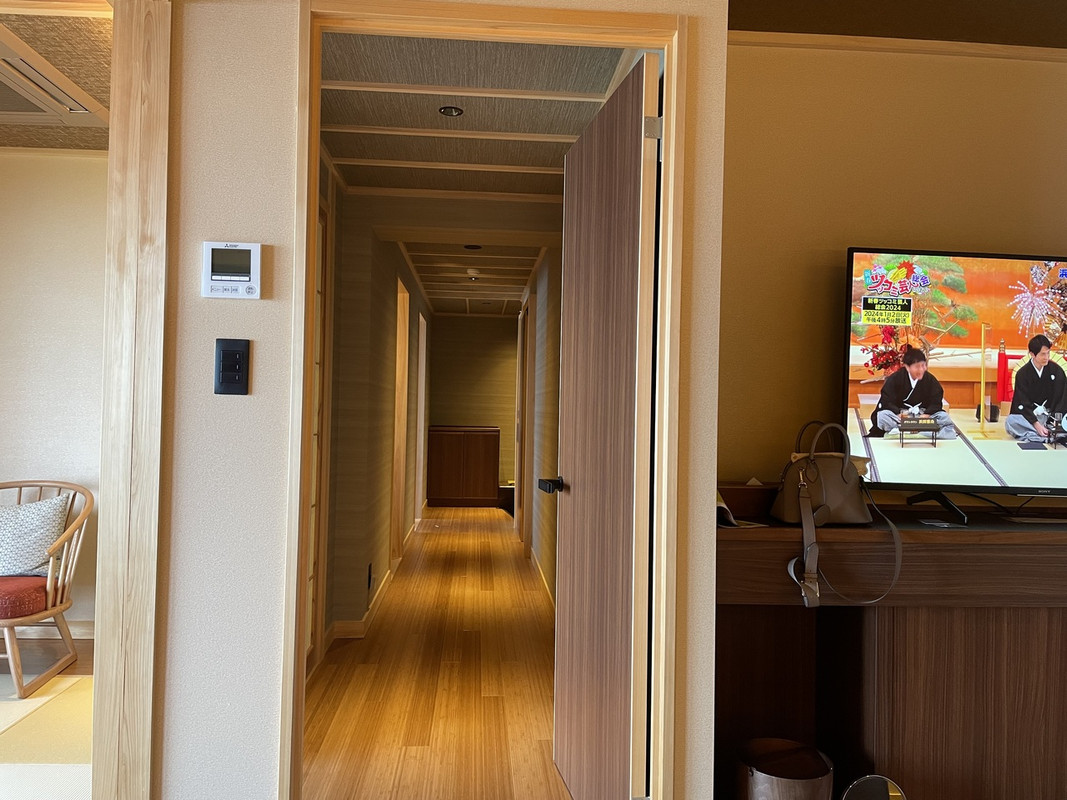 天空蒼空のお部屋です。年末年始は予約が取りにくく広いAタイプですが空きがありませんでした。なんとか他のタイプの露天風呂客室が年末に取れました。こちらは真ん中に露天風呂が位置していて、常にお湯が掛け流しなのでお気に入りのお部屋です。ベッドルーム、和室、ダイニングと3部屋あるので、家族それぞれが好きな空間でのんびりできるのも嬉しい。