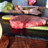 夕食はライトアップされた中庭でわいわいバーベキューを。沖縄県産豚肉や鶏肉、牛ステーキ、野菜、海ブドウのサラダが付いています。火起こしから片づけまでやってくれるので、楽に楽しめるのがいいところ。
