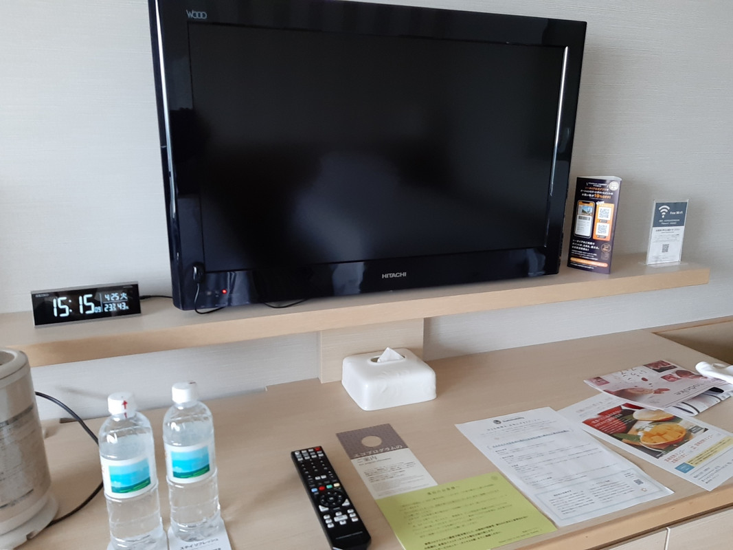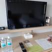 サロンスペースにはソファ(2人掛け)とテーブル。デスクとチェアも使いやすい。USBも1箇所。液晶テレビは中型。無料WiFi、冷蔵庫、ポット、金庫、ドライヤー、スリッパ、部屋着など、設備・アメニティーは十分。ミネラルウォーターも一人1本。