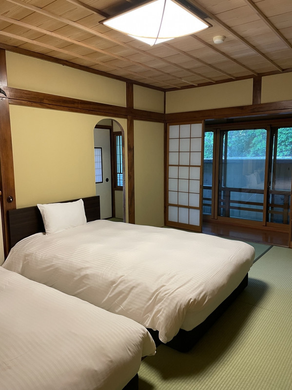 本館の客室は小さな中の間を挟んで10畳の居間とベッドのある寝室があり、周り廊下がある昔ながらの造りでとてもゆったりしていました。明治の建物なので隣りのお部屋の話し声は聞こえましたが不快な程ではなく、歴史ある建物がとても興味深かったです。
