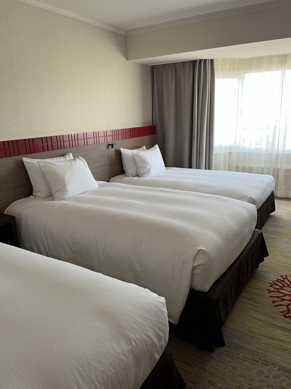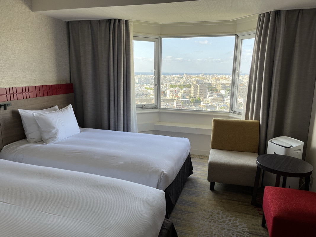 航空券付きのパックツアーで申し込んだのでホテルに過度な期待はしていませんでしたが、チェックイン時に上層階の客室にアップグレードして下さったり、ウェルカムクッキーのプレゼントがあったりとスタートから好印象でした。客室はきれいに改装されていましたが、水まわりは前のままで古さを感じます。ユニットバスなのは残念ですが、洗面台やバスタブは広くて使いやすく清掃も行き届いていました。今回は大人3人幼児2人での宿泊でしたが、エキストラベッドをいれても部屋は広々としていました。バスタオルやタオルは子供の分まで用意して下さりありがたかったです。朝食バイキングは種類も多く、沖縄料理も豊富でおいしくいただきました。チェックインするのが遅くなってしまったので屋外プールに入れなかったのが残念でした。