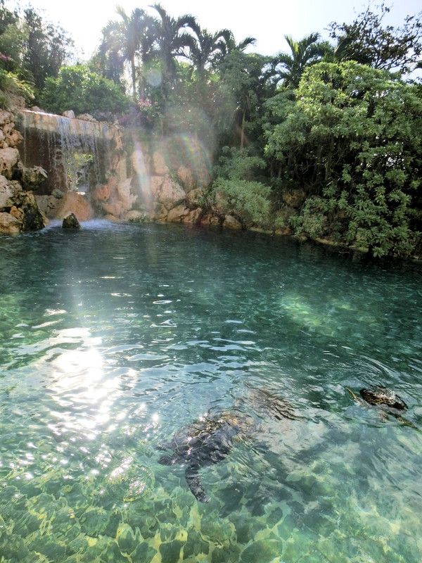 池には、ウミガメが泳いでいました。ゴルフ場が目の前で、開放感いっぱいです。受付と宿舎は道路を挟んでいて、少し広い部屋になっていました。バスも走っていて、時間外だとワンボックスで行先まで届けてくれます。