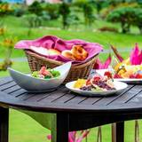 シギラセブンマイルズリゾートの中でも全室スイートルームが魅力な「シギラベイサイドスイート アラマンダ 宮古島」。本館以外にジャグジー、ラグーン、ヴィラ、プレミアムの5棟から成り、約半数の客室にプライベートプールが付いています。朝食は和洋・沖縄料理をたっぷりビュッフェで味わって。