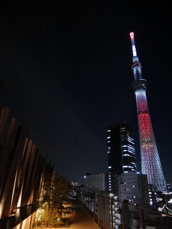 屋上階は宿泊客に開放されているテラスになっていて、ソファやテーブルがあり、東京スカイツリーをゆったり眺めるのに好適です。1 / 3