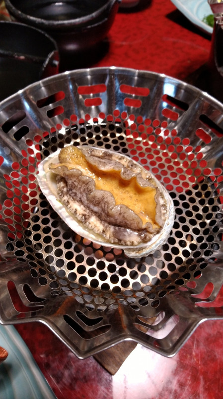 お部屋で和食をいただきました。アワビ、金目鯛はひとりひとつ出てきて、贅沢気分。アワビは目の前で生きている所からバター焼きで臨場感ありました。