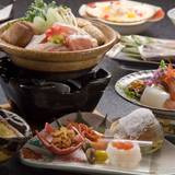 夕食は、旬の素材を活かした月替わりの「半会席料理」。魚介類を中心にした約10品が勢揃い♡2人での宿泊の場合、半個室のお食事処またはお部屋でいただきます。金目鯛の煮つけ、鮑の踊り焼きなどの別注料理も◎。