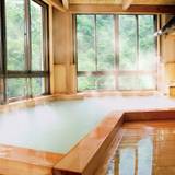 男女別の内湯「大檜風呂」では、裏山から湧く源泉を掛け流しにしています。とろりとした乳白色の硫黄泉で、美肌に導いてくれるそう。窓の外の景色と檜の温もりも心地良く、リラックスできますよ。化粧水などが揃っているのも◎。