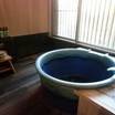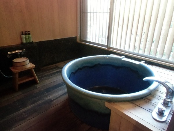 部屋は広い和室で、広縁や踏み込みを除いて15畳あり、内風呂は円形の青い陶器製のバスタブで雰囲気満点。