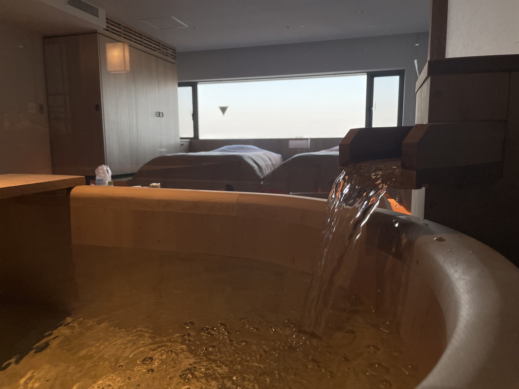 部屋の真ん中にヒノキ風呂があり、障子をあければベッドの向こうの海を見ながら入浴できます。