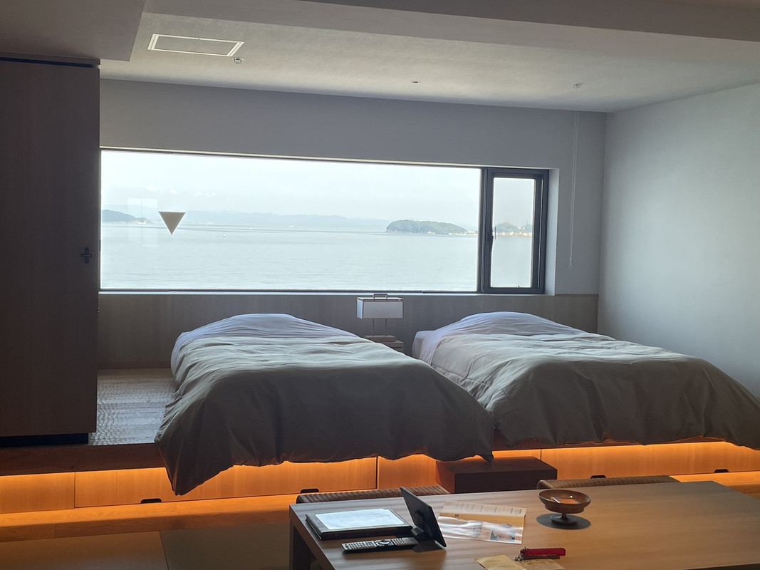 部屋の広い窓からは目の前に広がる綺麗な海を眺めることができてまさに絶景そのものでした。