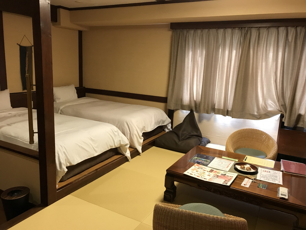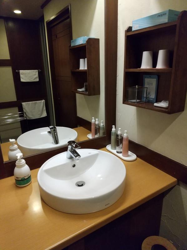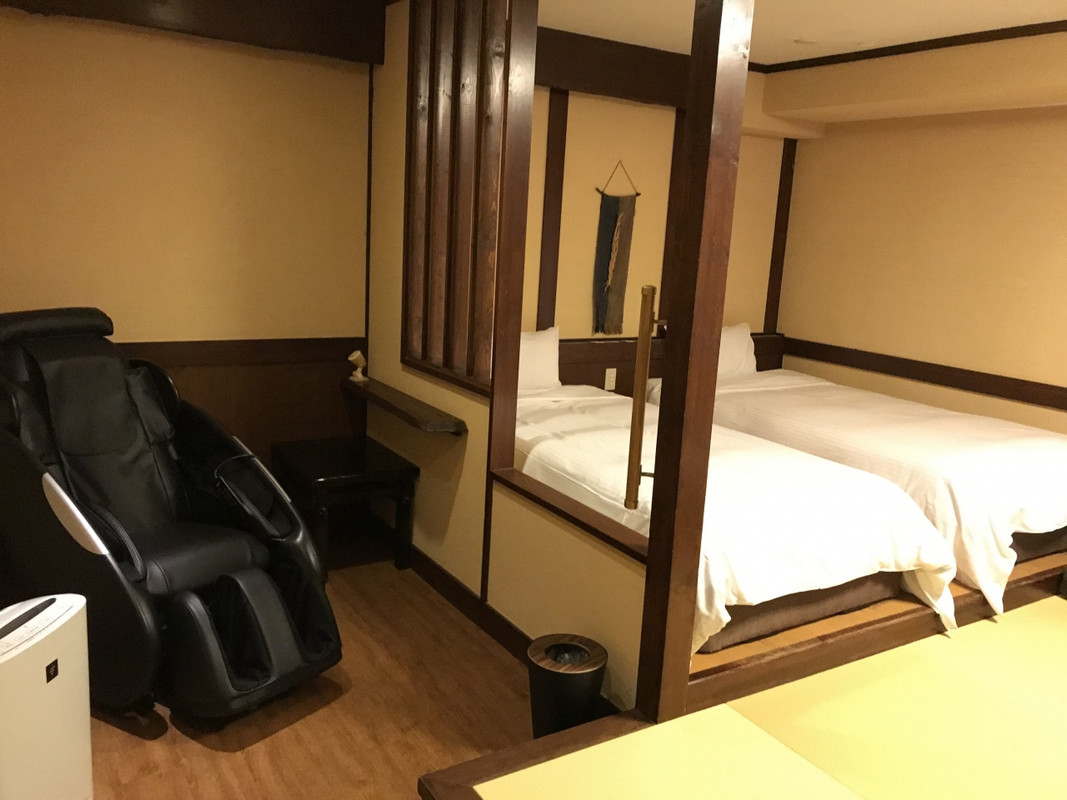 ふるさと館の和洋室に宿泊しました。部屋に風呂はなくトイレのみでした。アメニティはシンプルですが、備え付けボトルで女性用化粧品もありました。マッサージチェアも部屋に備わっています。