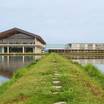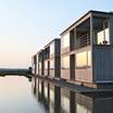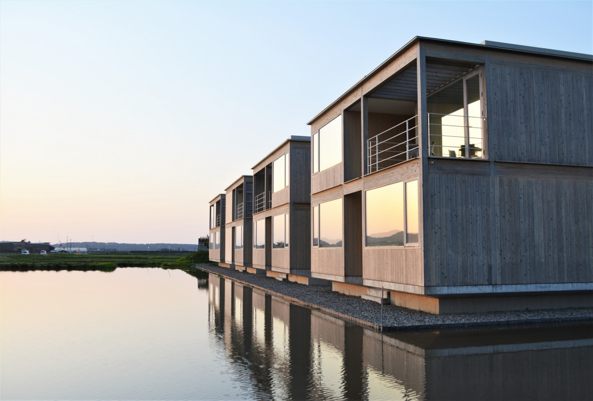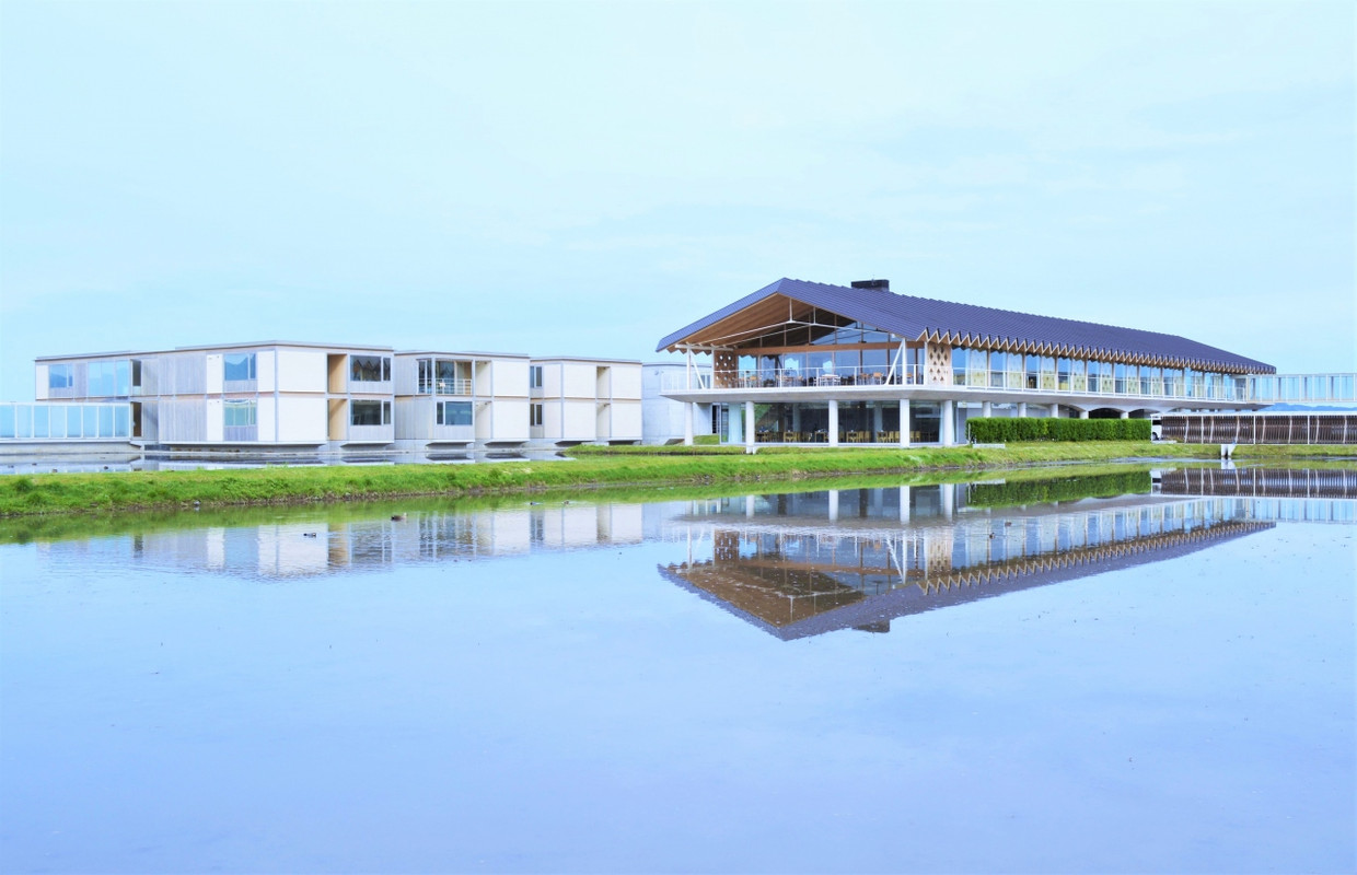 水田の上に高床式で作られた個性的なホテルです。木造のキューブのような部屋が3棟あり、露天風呂とサウナは1箇所にあります。