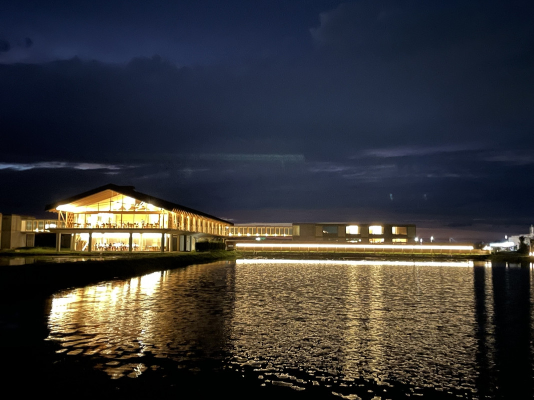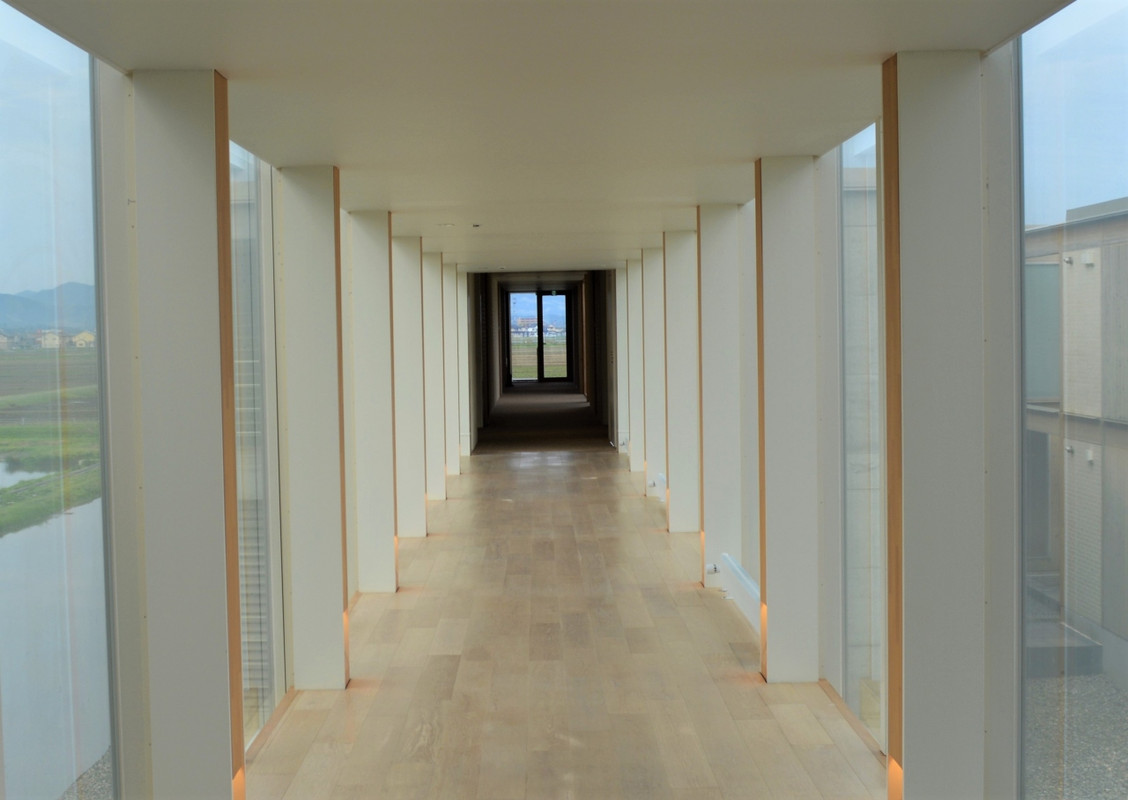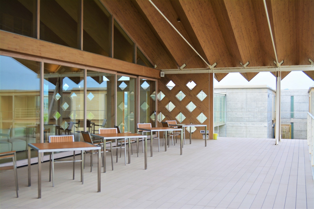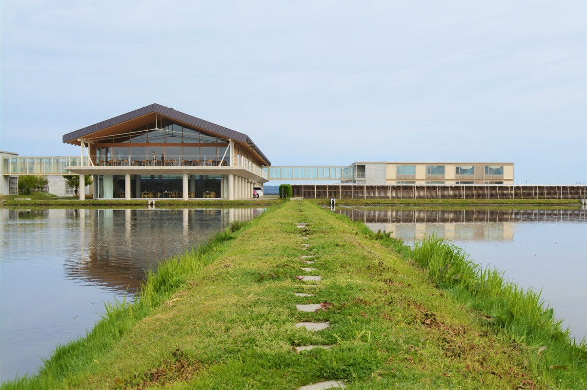 庄内空港から車で約20分の「SHONAI HOTEL SUIDEN TERRASSE」。田園に浮かぶように立つ広大なホテルの中には至るところに本があり、幻想的な風景とともに読書を楽しめます。山形の味覚が満載の夕食やセルフラウンジなど食の楽しみも。坂茂氏の建築も見どころです。
