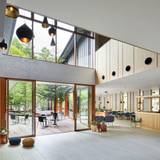 中庭を望むロビーで