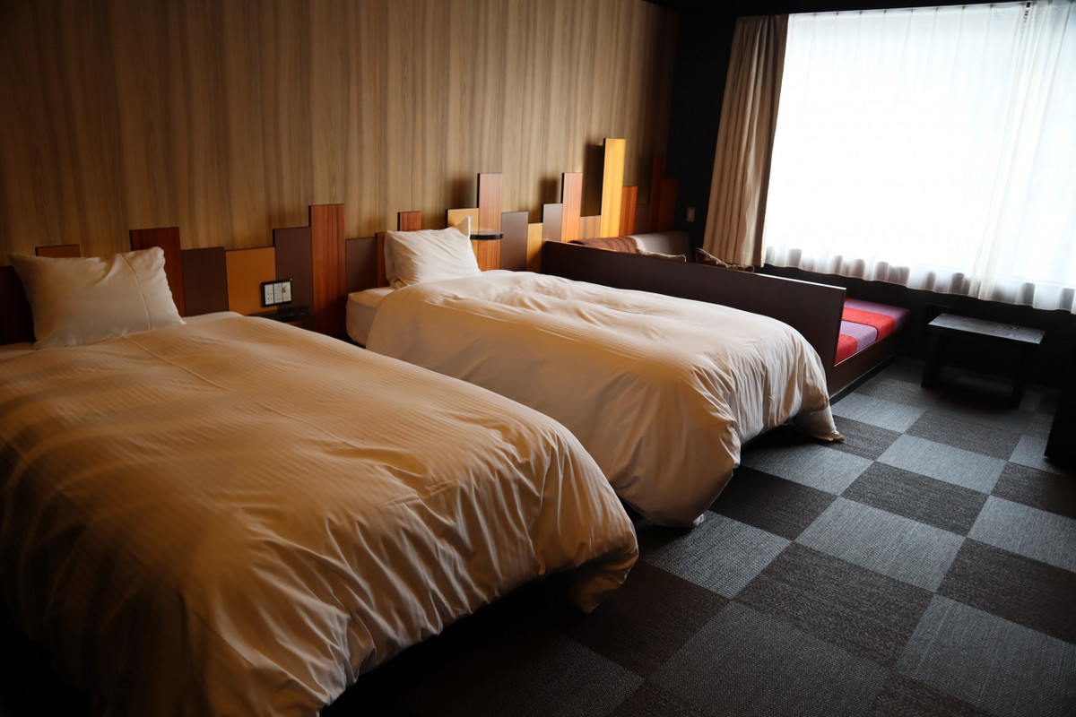 広々としたロビー、日本酒とシードル(リンゴのお酒)とリンゴジュースが振る舞われるラウンジ、広い客室と、チェックイン直後の印象は良い。