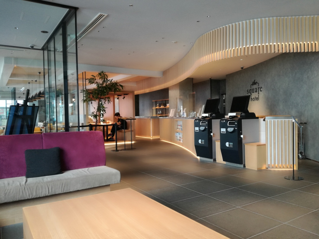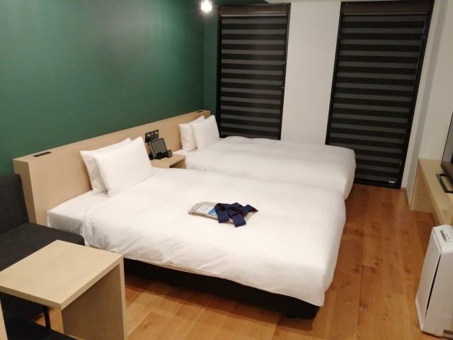 チェックイン/チェックアウトはタッチパネルで、ツインの部屋にアップグレードしてくれました。