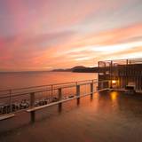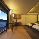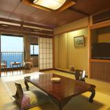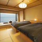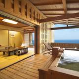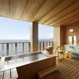 駿河湾を目の前に望む「稲取温泉 石花海 (せのうみ)」。最上階の露天風呂は眺めが特に美しく、朝と夜で変わる海の表情は絶景です。夕食は、金目鯛をはじめとする新鮮魚介の和食コース。伊勢海老やアワビなどの豪華食材も味わえます。温泉と魚介を満喫したら、全室オーシャンビューの客室で寛いで。