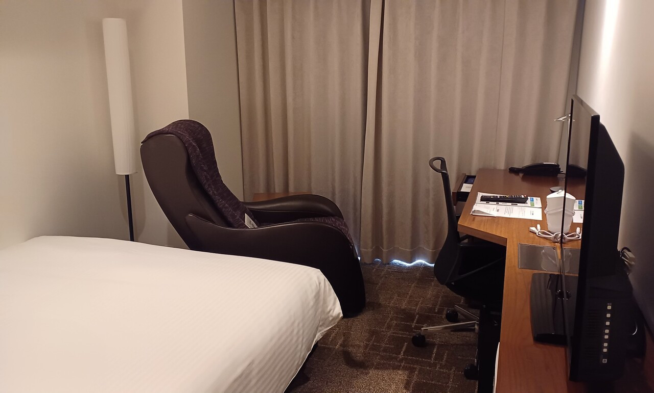 国際展示場駅からすぐのところにあるホテルです。バスルームが広めな点は良かったのですが、お部屋の中に大きなマッサージチェアがあり、窓の近くの場所を占領していました。これ、デフォルトで置いておくおく必要があるのか謎ですね。遮光とベッドの寝心地は良かったです。