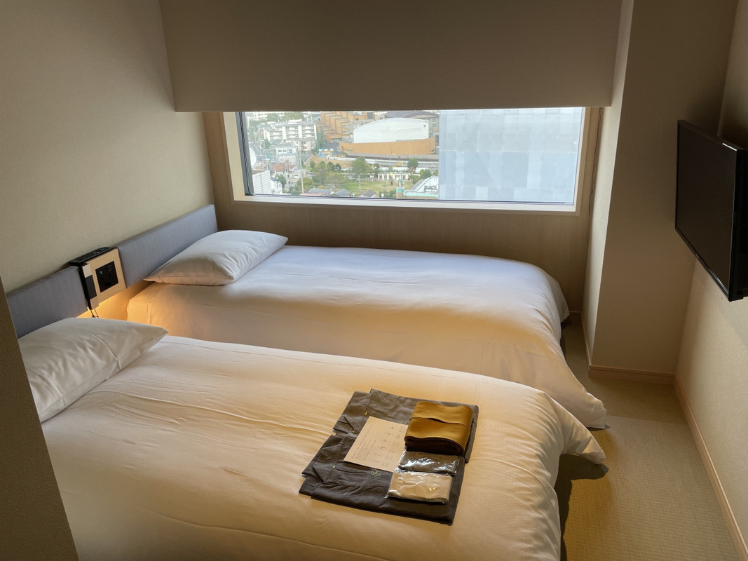 シャワーブースが設けられたシンプルなツインルーム。モダンな雰囲気でカジュアルなホテルステイに◎3~15階にあり高層階なら都会の景色も楽しめる。