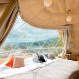 「湯布院温泉郷 グランピング COMOREBI(コモレビ)」は、自然豊かな山あいに佇むグランピングリゾート。ホテル感覚で快適に過ごせるゲストルームが非日常へと誘います。女心をくすぐるおしゃれなインテリアも魅力。フォークとナイフで食すラグジュアリーなフレンチBBQをはじめとする豪華なディナーが旅を彩り、夜は温泉でリラックス。大切な人と、森の中で特別な時間を過ごしませんか。