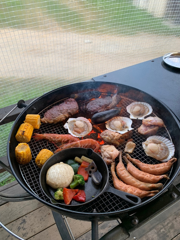 お肉が美味しい!海老やホタテなど海鮮もあり、浜辺BBQ感も楽しめます。骨付きウインナーやとうもろこし、マシュマロなど、子どもが楽しめるものも!