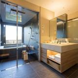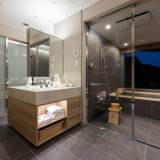東館客室には、銀泉と呼ばれる温泉を楽しめる半露天風呂と、ミストサウナが完備されています。Plusui(プラスイ)のアメニティ、Dyson(ダイソン)のドライヤーなど、アイテムも上質。優雅なひと時を楽しめます。